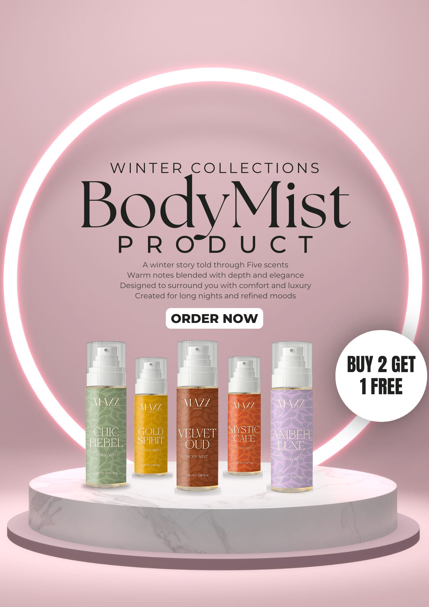 Made with care for cozy winter moments, our signature body mists wrap you in warmth, elegance, and scents you’ll fall in love with from the first spray.